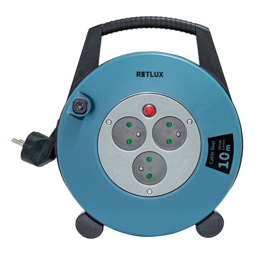 Retlux - Prelungitor cu tambur, 3 prize, Tip E, 10 m, albastru/negru