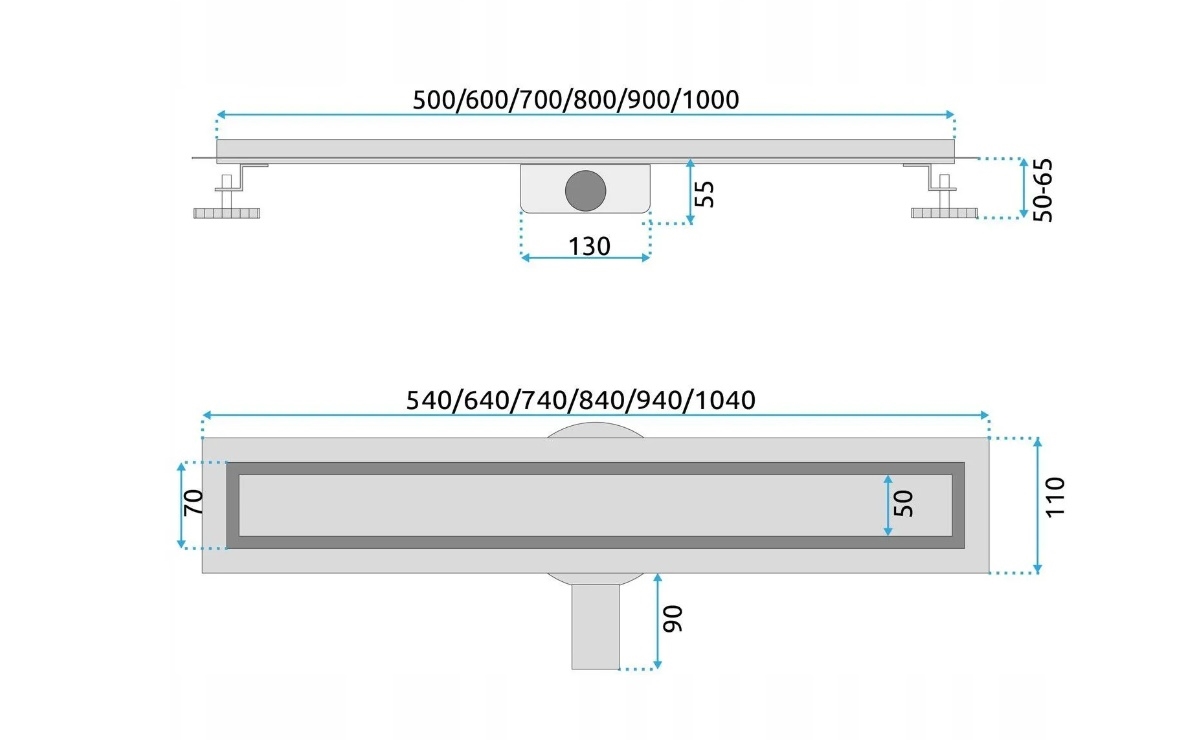 • Datorită picioarelor reglabile pe înălțime (50–65 mm), scurgerea poate fi adaptată ușor la diferite condiții ale pardoselii.