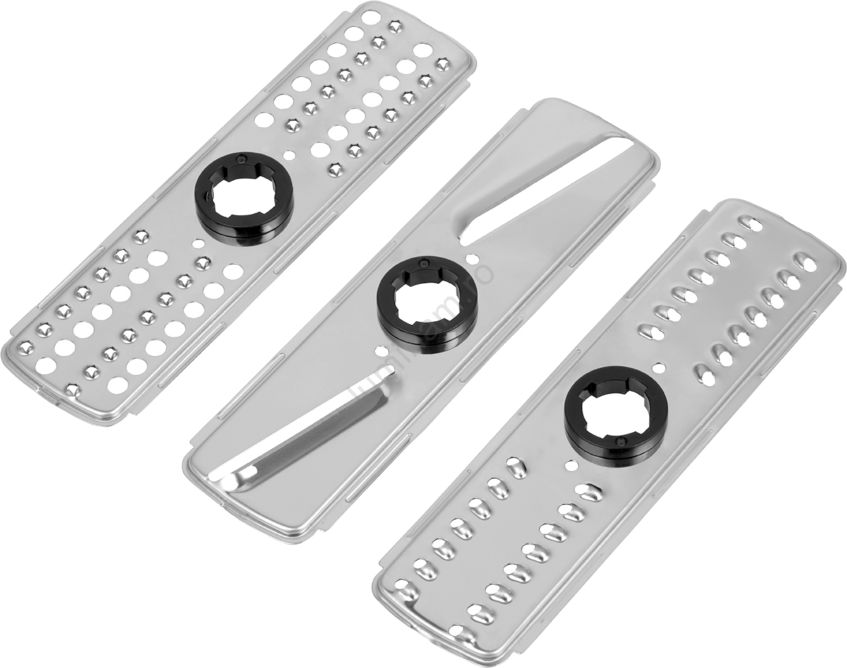 • Accesoriu de răzuire cu 3 plăci interschimbabile: tăieței, felii și rondele de cartofi.