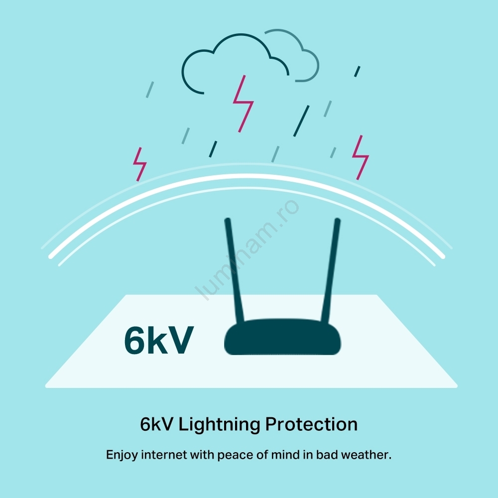 • Este compatibil cu standardul Wi-Fi 4 în banda de 2,4 GHz, cu o viteză wireless de până la 300 Mb/s, ideal pentru navigare, streaming și rețeaua de acasă.