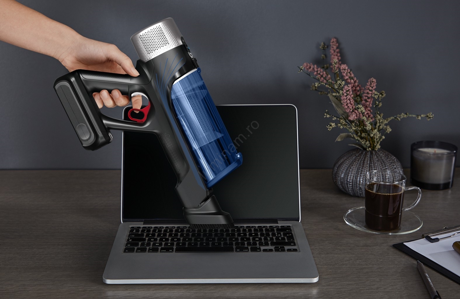• Aspiratorul este extrem de ușor: unitatea de mână cântărește aproximativ 1,1 kg, iar întregul aparat cca 2 kg — manipularea și curățarea sub mobilier devin mult mai simple.