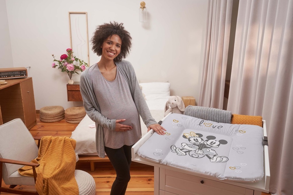 • Saltea moale pentru schimbarea sau înfășarea bebelușului, cu imaginea personajelor Mickey Mouse și Minnie.