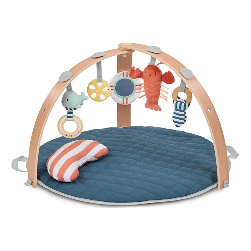 • Include 5 jucării detașabile din materiale de calitate: homar din pluș cu clopoțel, inel din lemn cu material textil, balenă cu zornăitoare, oglindă în formă de colac de salvare și inel de dentiție.