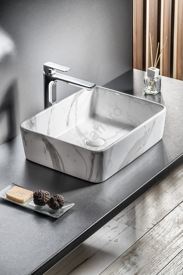 • Lavoar ceramic pentru montaj pe blat cu efect de piatră.