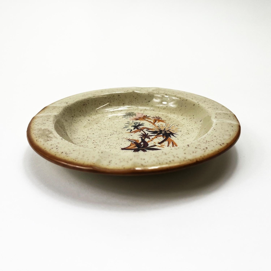 • Un scrumieră din ceramică cu un diametru de 16 cm, de culoare bej și cu un model de ciulin.