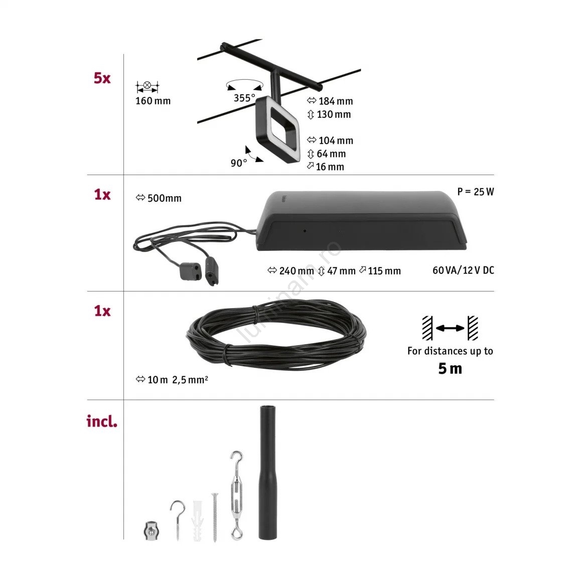 • Paulmann 94485 - Set complet 5 x LED (4,8 W), sistem pe cablu FRAME, 230 V, negru