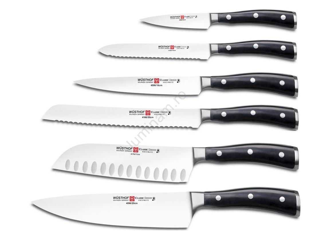 • Setul include: cuțit pentru legume 9 cm, cuțit pentru mezeluri 14 cm, cuțit pentru șuncă 16 cm, cuțit Santoku 17 cm, cuțit pentru pâine 23 cm, cuțit de bucătar 20 cm, bloc negru pentru cuțite.