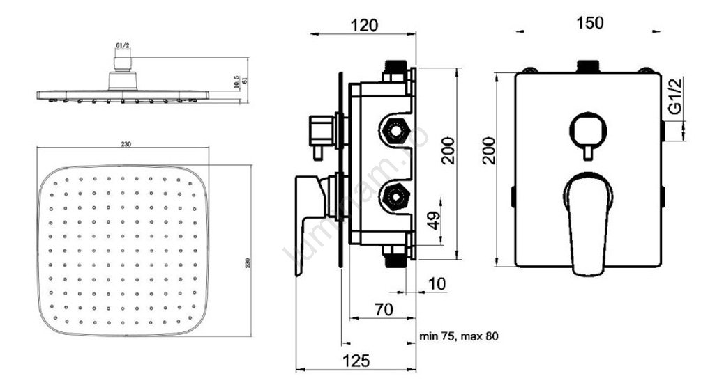 • Pachetul include: baterie ascunsă cu cartuș, pară de duș cu 3 funcții, cot de perete pătrat cu suport pentru para de duș, furtun de duș metalic cu funcție antirăsucire și pălărie de duș cu braț.