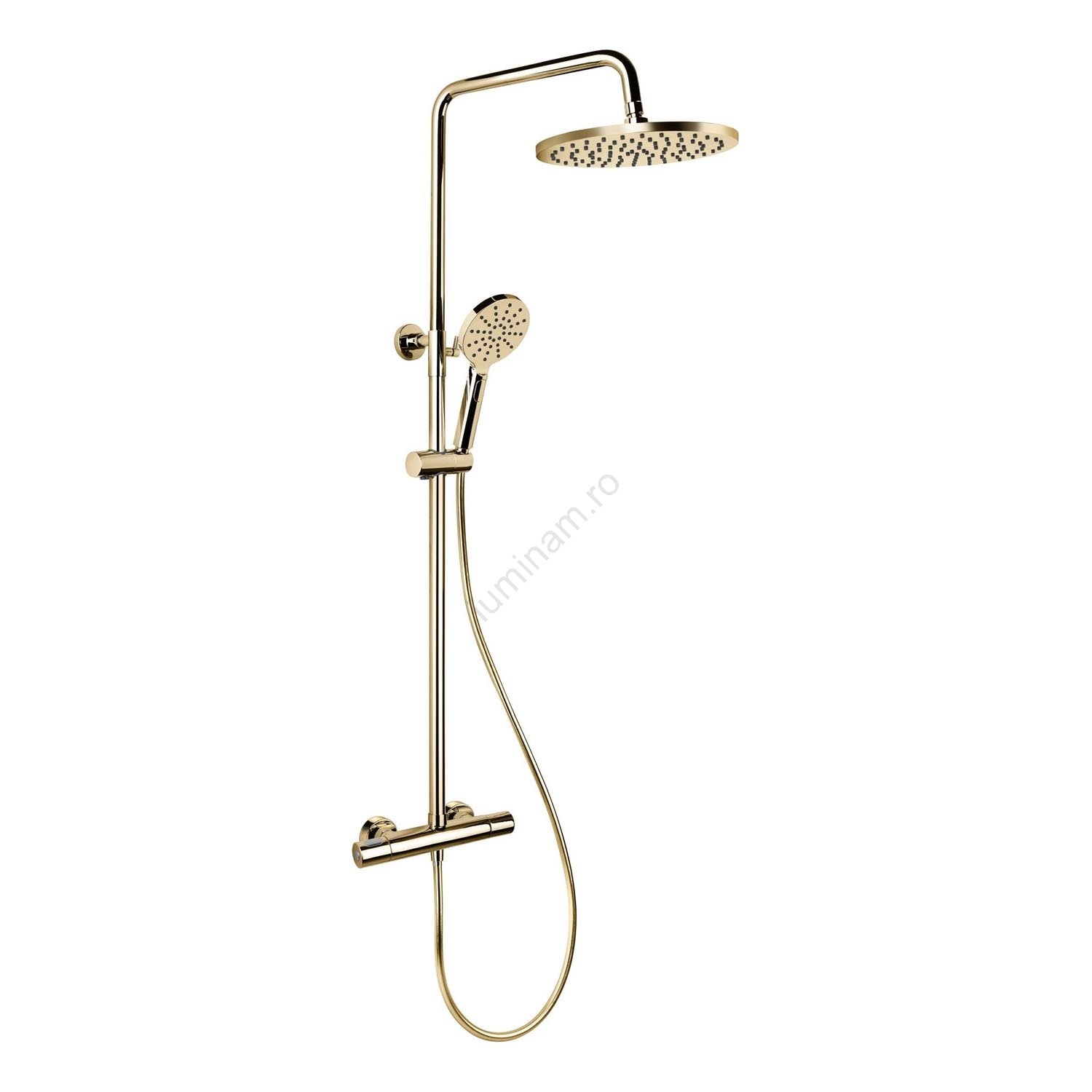 • Bară de duș și cap de duș superior din oțel inoxidabil cu finisaj PVD.