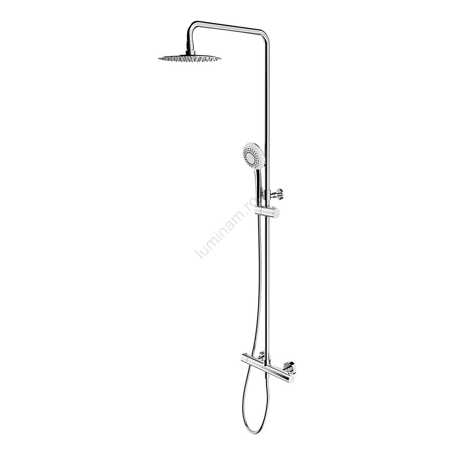 • Setul include: baterie termostatică din alamă, cap de duș din oțel inoxidabil, duș manual din alamă (3 funcții), furtun de duș din oțel inoxidabil, braț de duș din alamă, bară de duș din alamă, suport pentru dușul manual din alamă, comutator de flux pentru capul de duș/dușul manual integrat în butonul de apă, închidere pentru apa caldă la 38 °C.