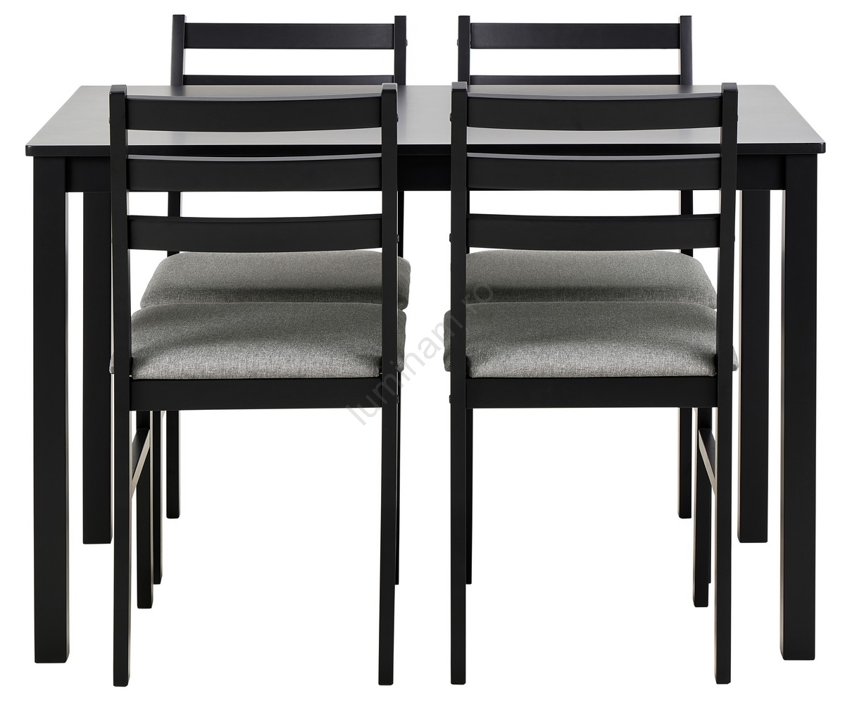 • Constă dintr-o masă dreptunghiulară și 4 scaune asortate cu șezuturi tapițate gri deschis, toate realizate din lemn masiv cu finisaj mat negru.