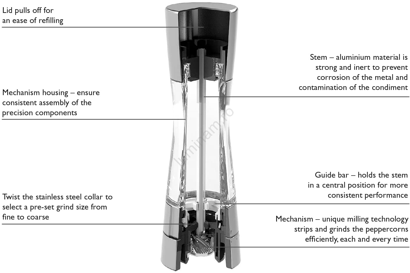 • Râșnițele sunt dotate cu un mecanism din oțel carbon întărit (piper) și un mecanism de măcinare ceramică cu tăiș diamantat (sare).