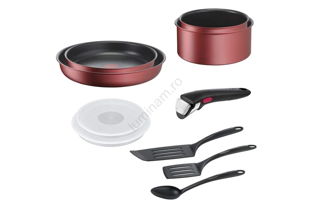 • Setul include: tigaie cu diametrul de 22 cm, tigaie cu diametrul de 26 cm, tigaie cu diametrul de 16 cm (1,8 l), tigaie cu diametrul de 18 cm (2,3 l), 1 lingură, 2 spatule, 2 capace ermetice de 16 și 18 cm, 1 mâner detașabil.