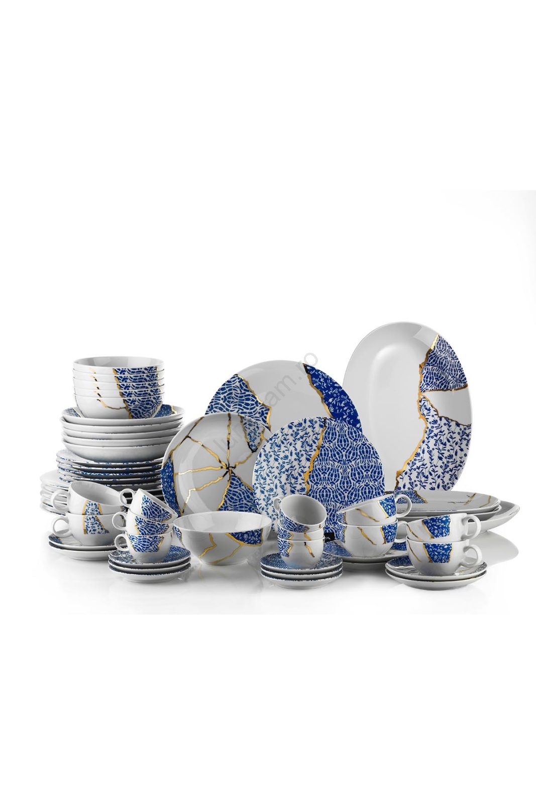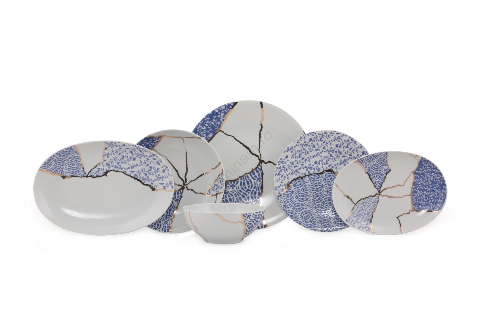 Set de veselă, 28 piese, din porțelan, alb/auriu/albastru
