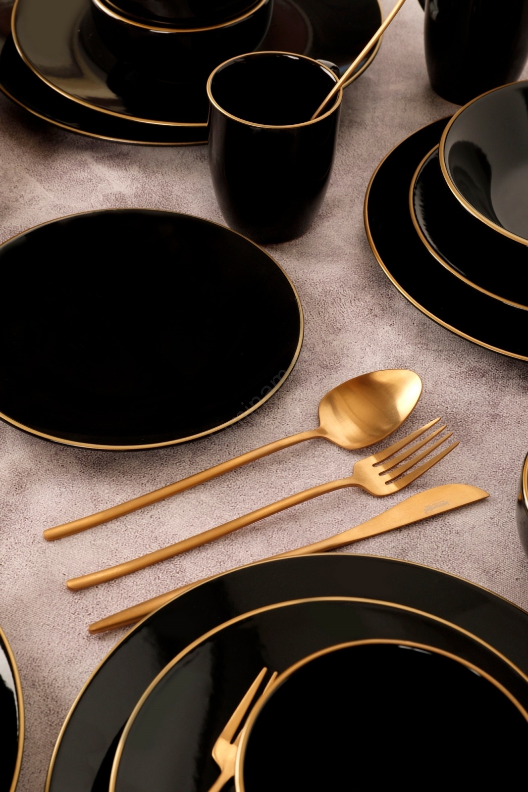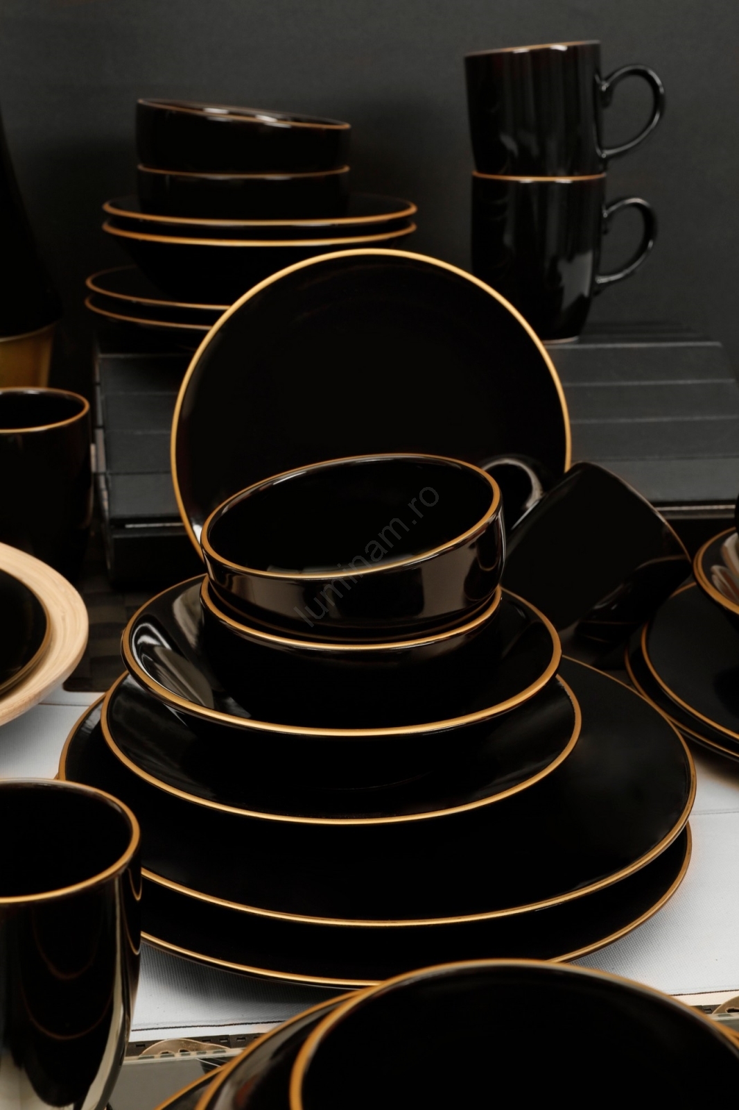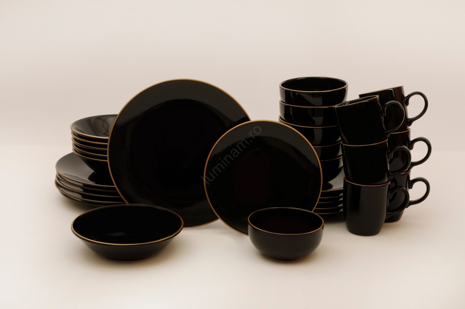 Set de veselă, 30 piese, negru/auriu, din ceramică vitrificată