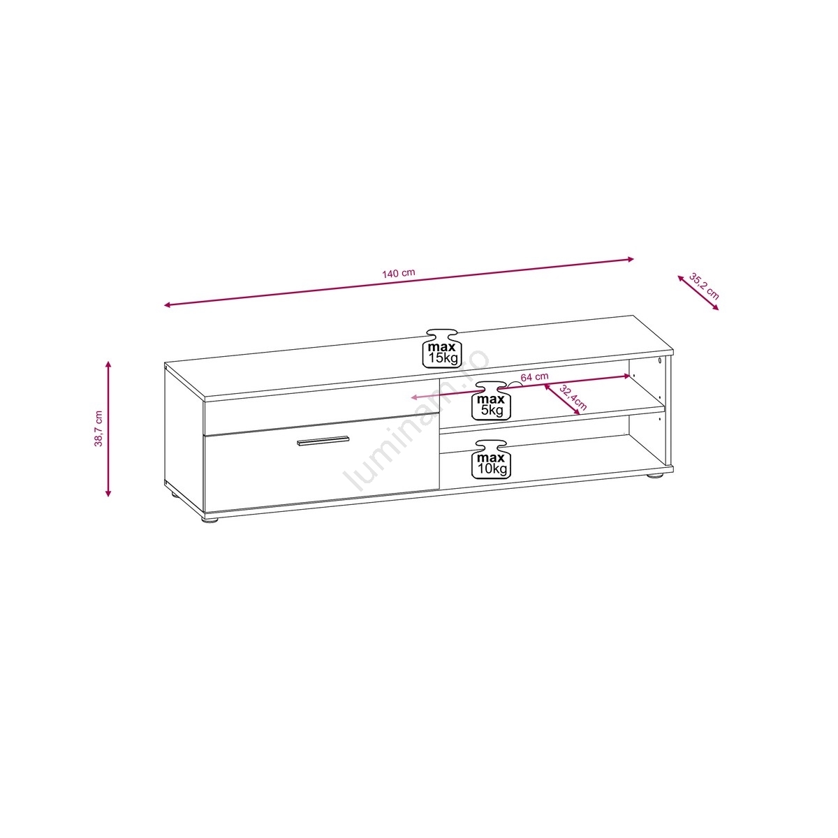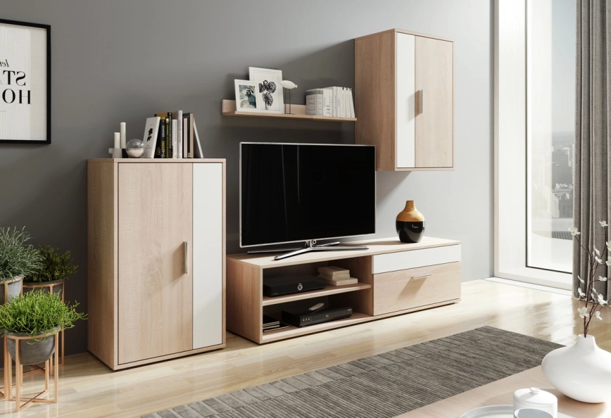 • Include o comodă TV spațioasă, cu rafturi deschise pentru echipamente media și compartimente închise pentru depozitare ascunsă.