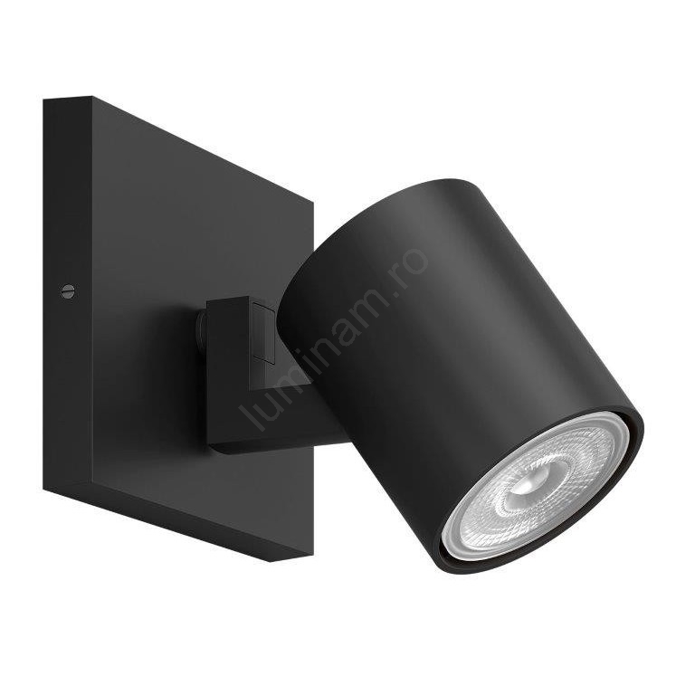 • Spot LED cu luminozitate reglabilă din seria Hue de corpuri de iluminat inteligente de culoare neagră.