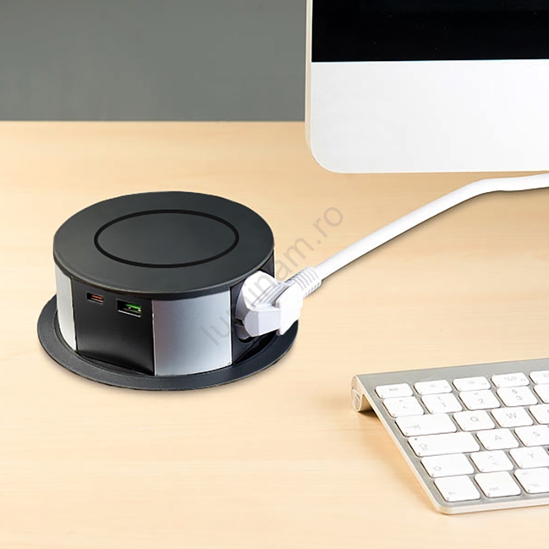 Coloană de prize pentru blat de masă cu încărcare wireless Qi 3x230V + 1xUSB-A + 1xUSB-C negru/argintiu