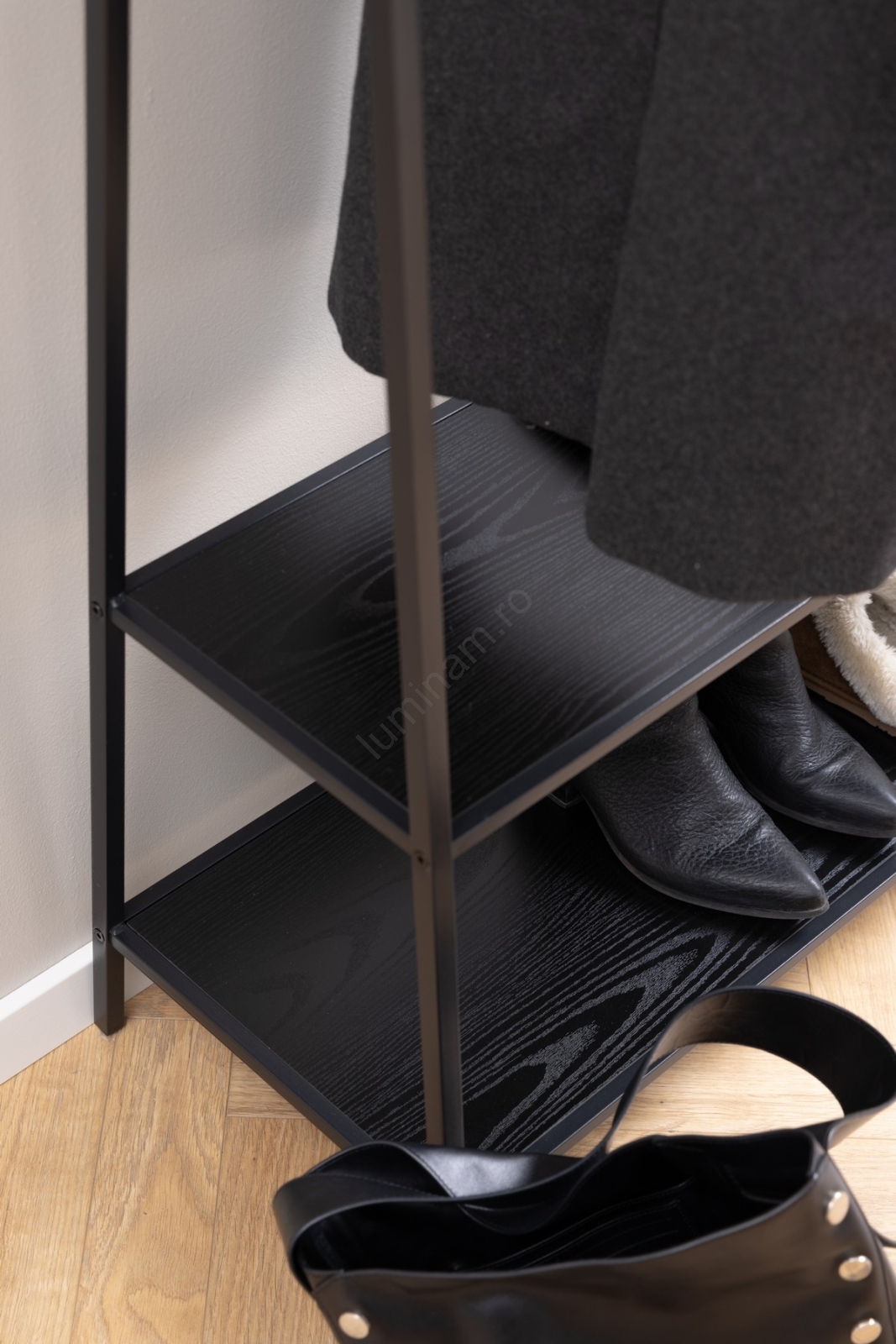 • Cadru din oțel vopsit în pulbere, mat, negru, 2 rafturi și bază din melamină neagră, brută, cu tijă pentru haine.