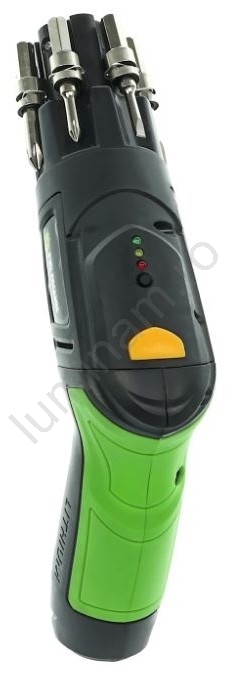 • Șurubelniță electrică fără fir cu cap cu 6 biți pe brațe pivotante.
