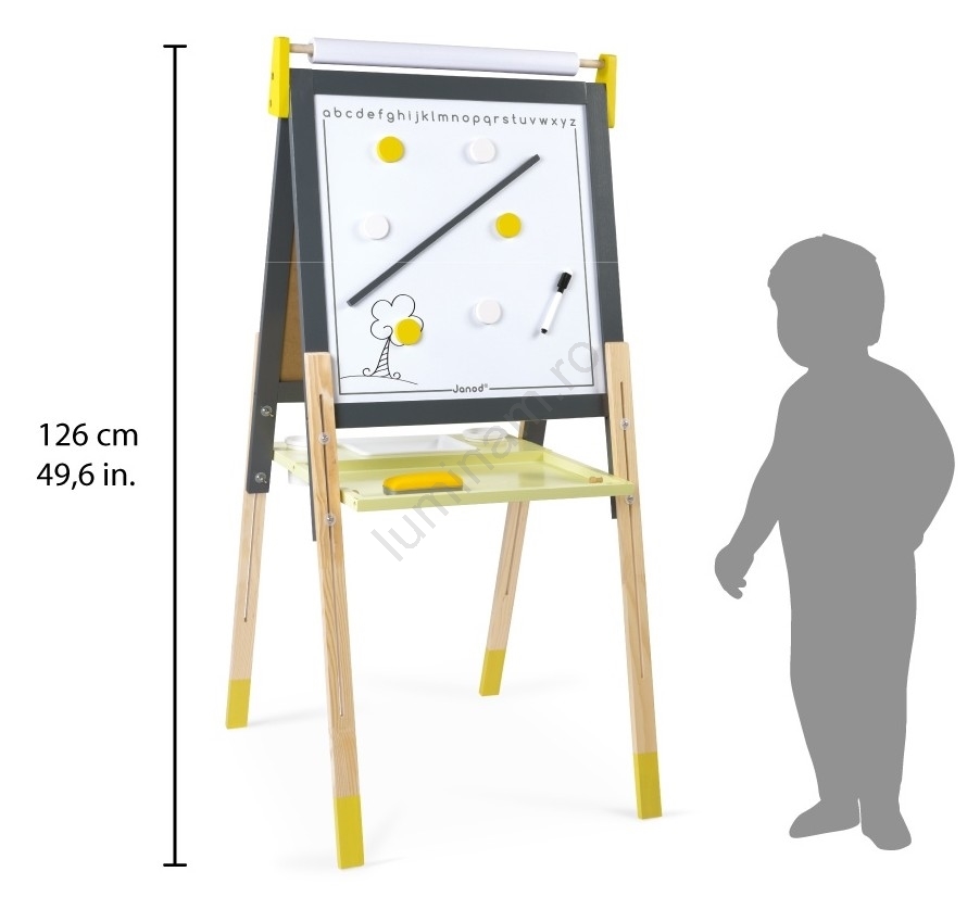 • Tabla magnetică din lemn este reglabilă pe înălțime, adaptându-se și crescând odată cu copilul.