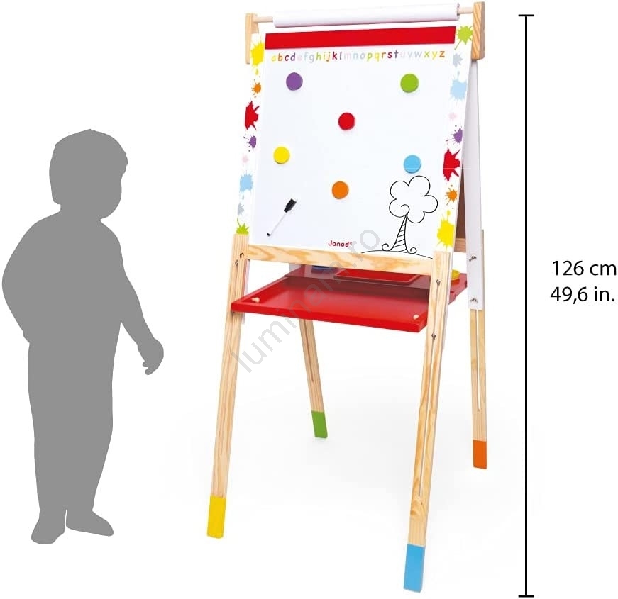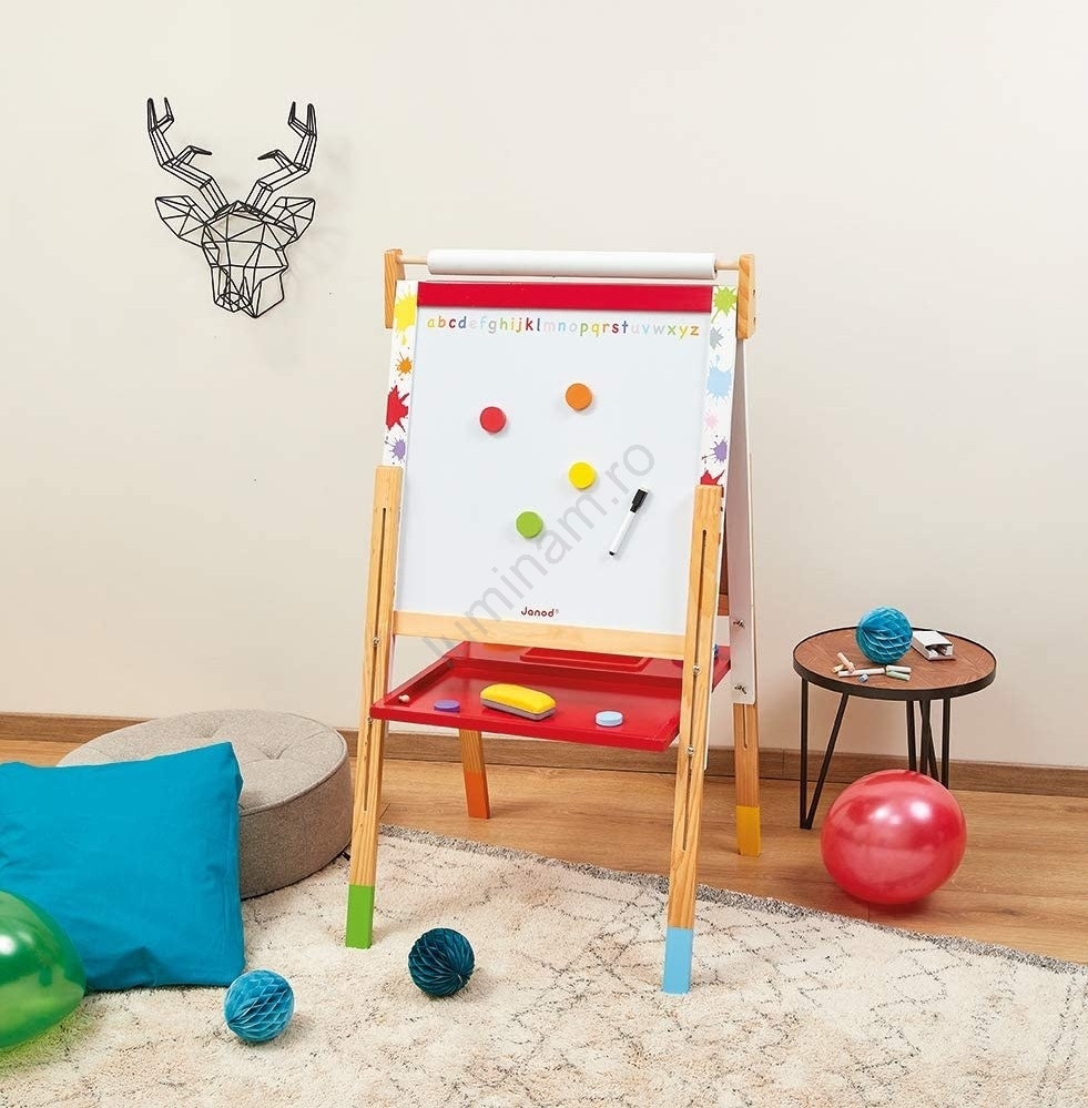 • Tabla magnetică pentru copii include și o rolă de hârtie ce poate fi fixată în partea superioară a tablei, transformând-o instant într-un suport de desen, asigurând astfel distracția continuă.