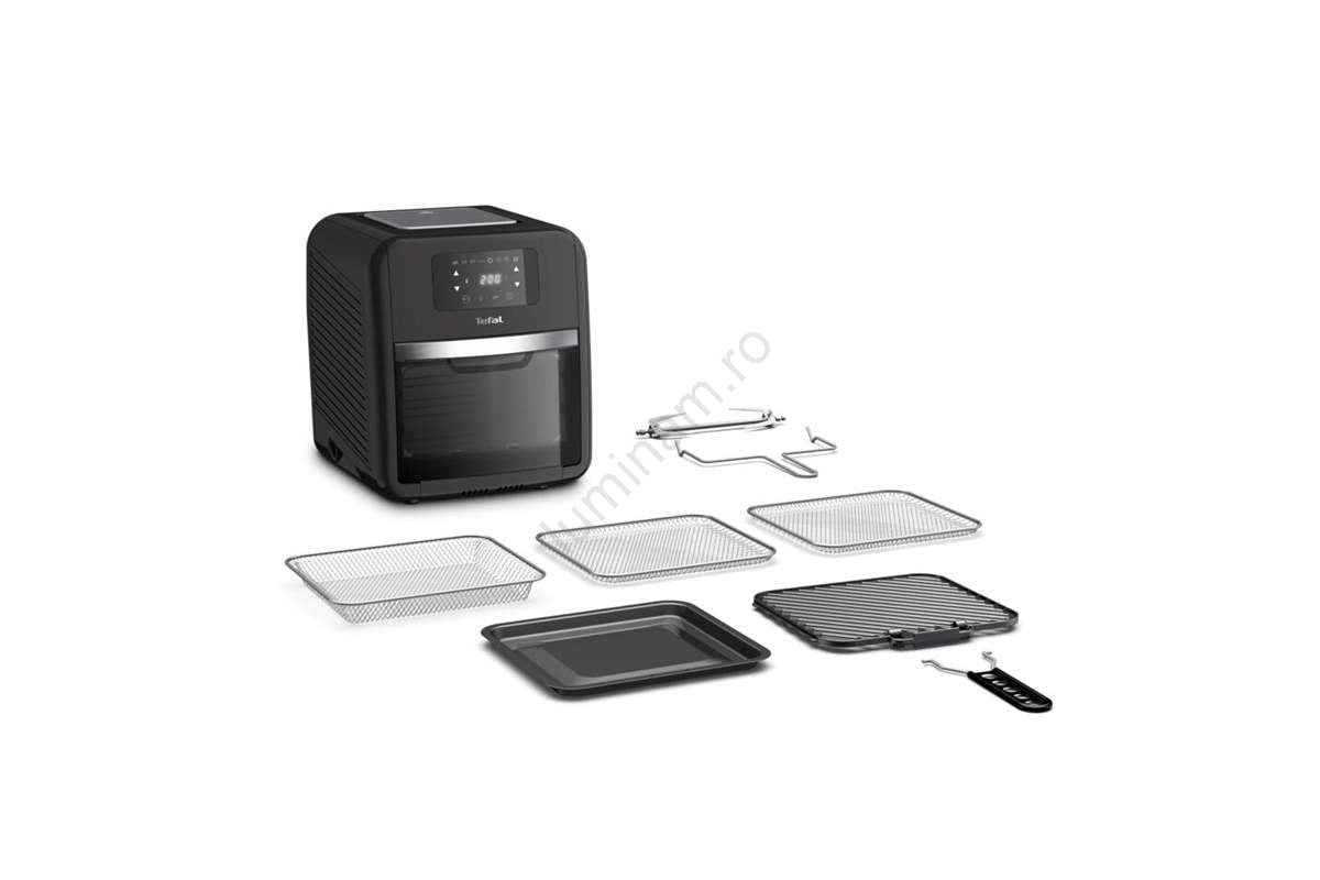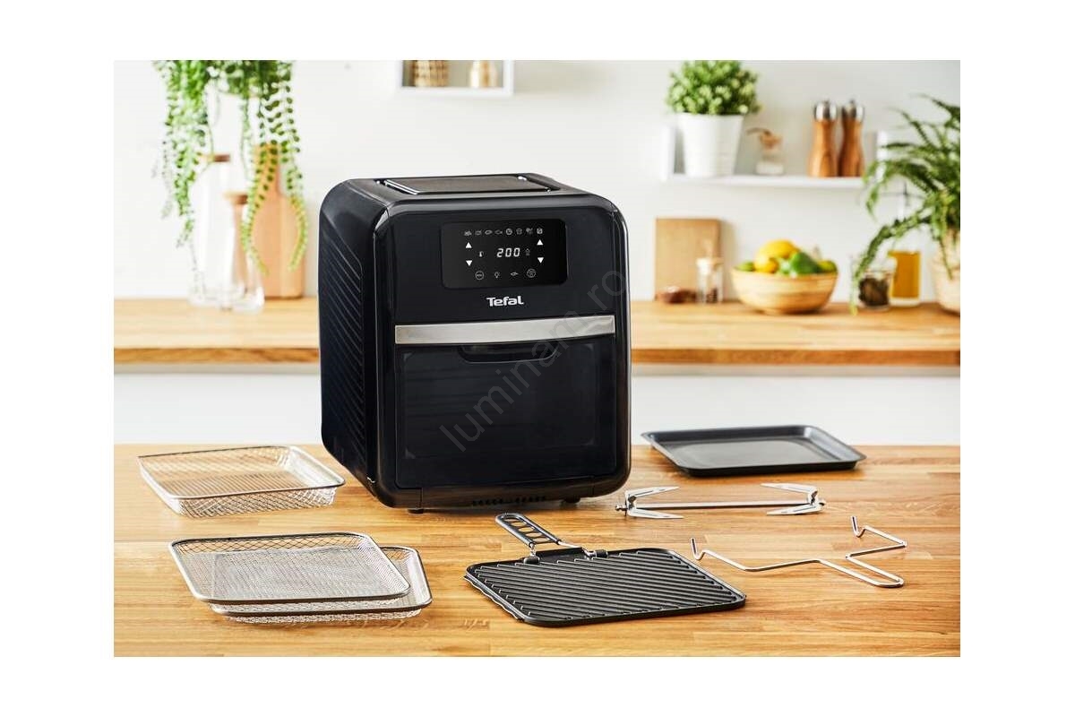 • 9 funcții într-un singur aparat: prăjire cu aer cald, gratinare, grill, coacere, broil (rumenire intensă), deshidratare, rumenire ușoară, rotisare și încălzire.