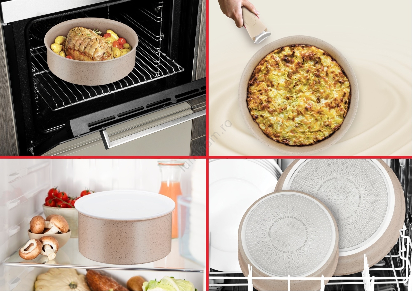 • Suprafața interioară este prevăzută cu stratul antiaderent Mineralia+, care permite gătitul cu un minim de grăsime și ușurează curățarea.
