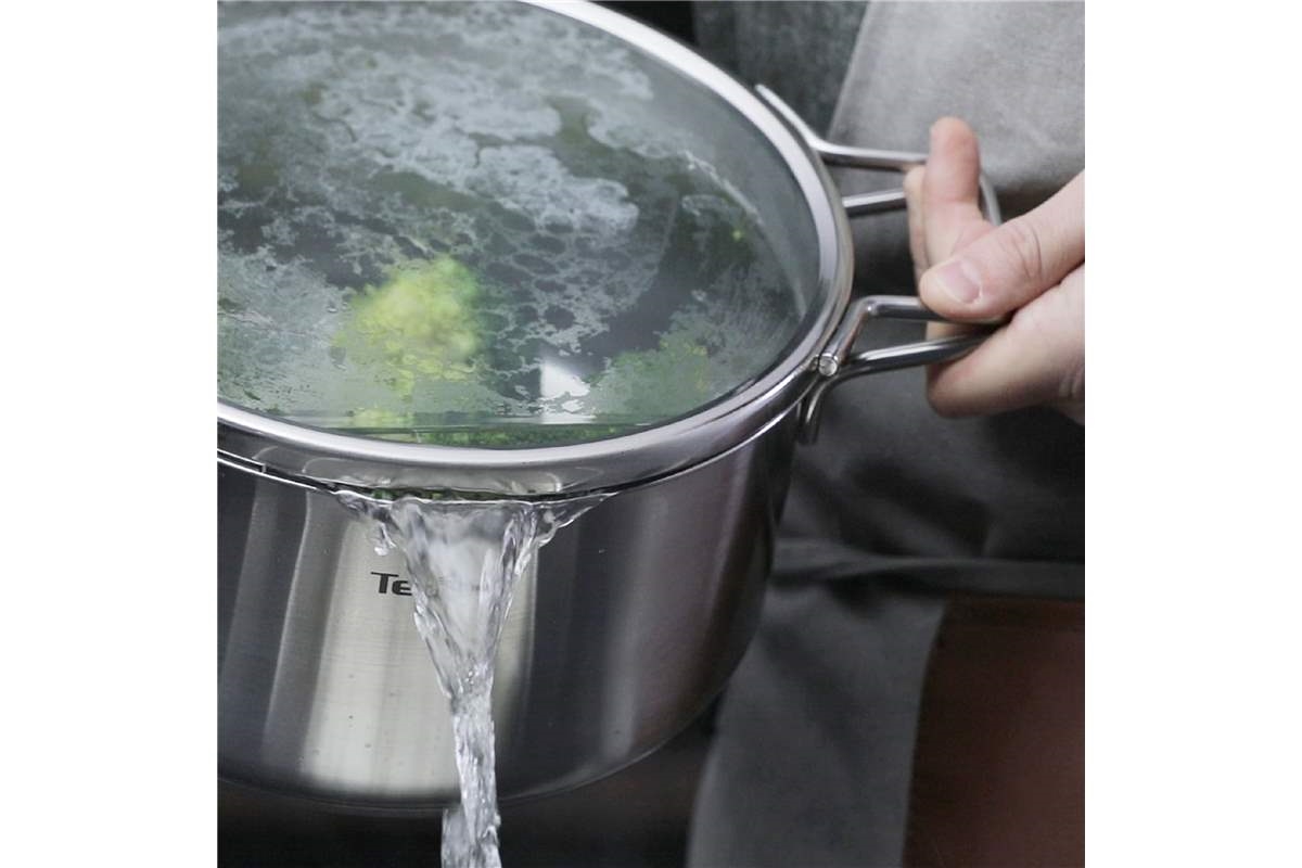 • Ciocuri practice cu orificii mici pe fiecare vas permit strecurarea directă (de ex. a apei de la paste).