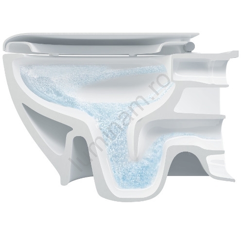 • Apa de spălare curge prin distribuitorul de apă doar din partea din spate a vasului WC și, datorită formei speciale, spală perfect interiorul.