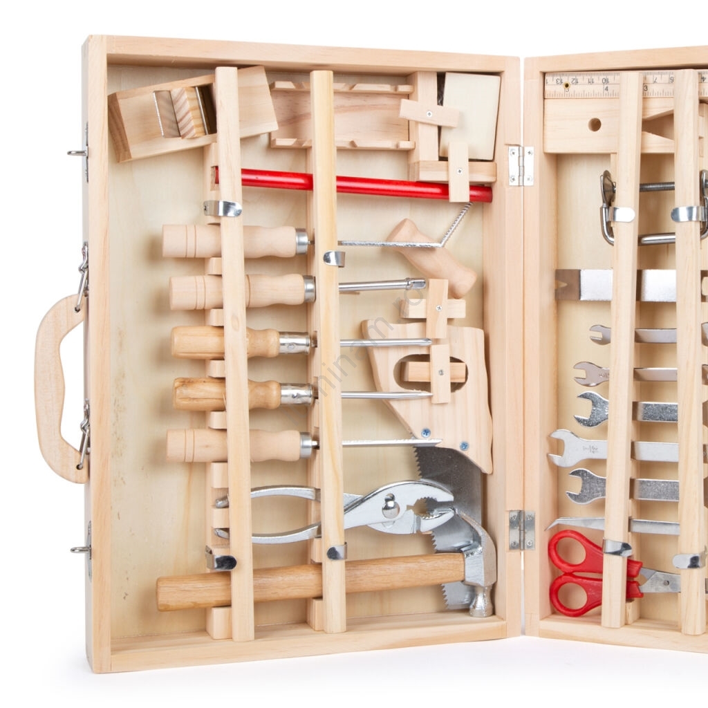 • Trusă suspendată din lemn cu 48 de piese pentru micii bricoleri.