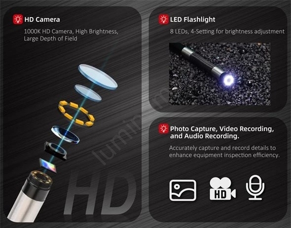 • La capătul sondei se află un obiectiv cu diametrul de 8 mm echipat cu opt LED-uri cu intensitate reglabilă în patru trepte, asigurând iluminarea ideală a zonei inspectate.