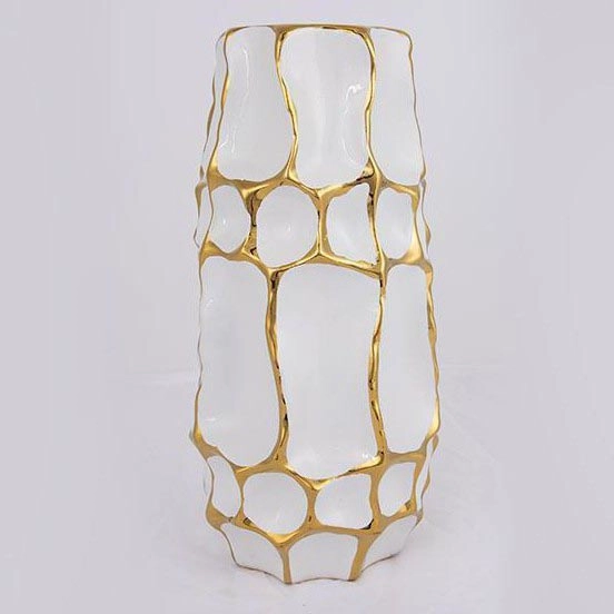 • Contrastul culorilor alb și auriu conferă vazei un aspect sofisticat și modern.