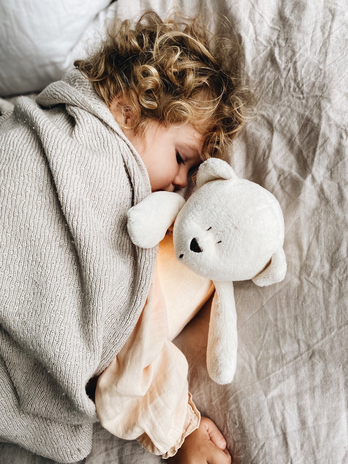 • Pluș de îmbrățișat cu sunete și lumină Moonie ursuleț 2.0 organic polar
