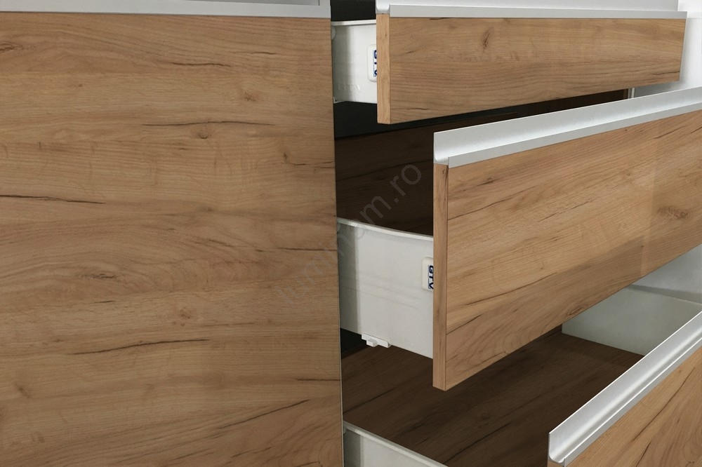 • Dulapurile superioare sunt echipate cu pistoane pe gaz, iar în sertare sunt integrate glisiere metalice încapsulate de calitate.