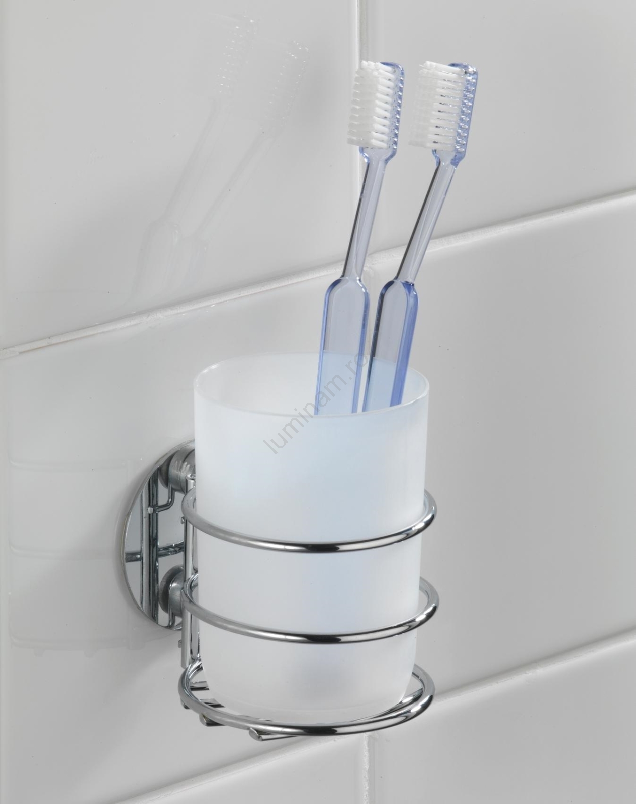 WENKO 18779100 - Suport pentru periuțe de dinți TURBO-LOC rotund, din oțel, 7,5 x 9 cm, crom lucios/alb