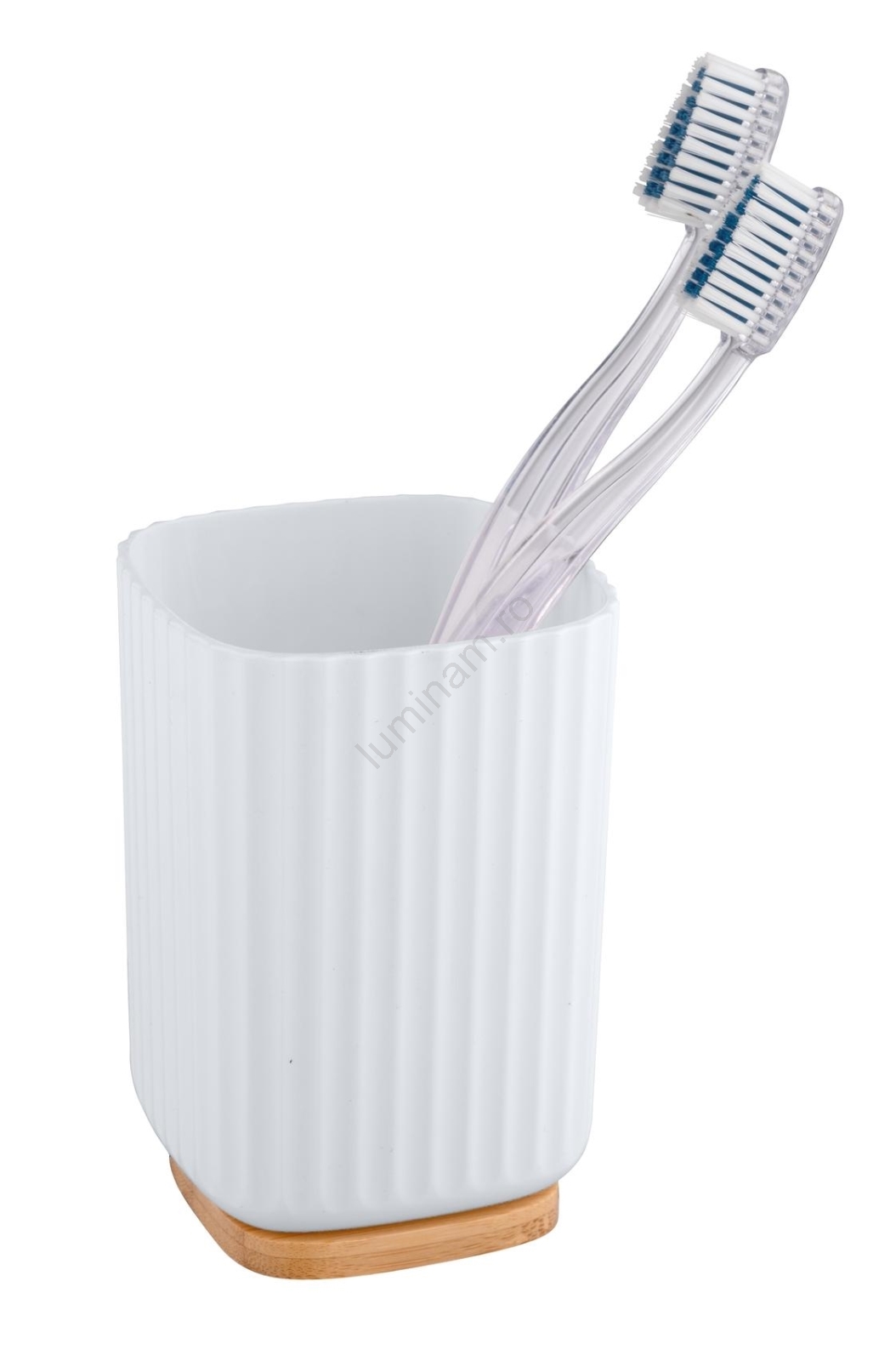 • Pahar elegant pentru periuțele de dinți, finisaj modern alb cu partea inferioară din bambus.